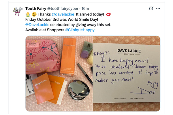 Oct10 – Birgit G from the West Coast won the Clinique Happy + makeup set on X