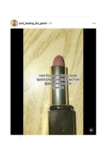 May20 – Christine B won the beautiful Lauder lip gloss on IG